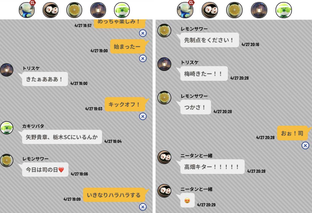 サポクラではサポーター同士で「クラン」というグループを組み、クランの仲間たちと一緒に試合観戦をすることが出来る。クランは最大5人まで。試合を見ながら程よい会話のやり取りができる最適な人数なので、かなり密なコミュニケーションを楽しめる。